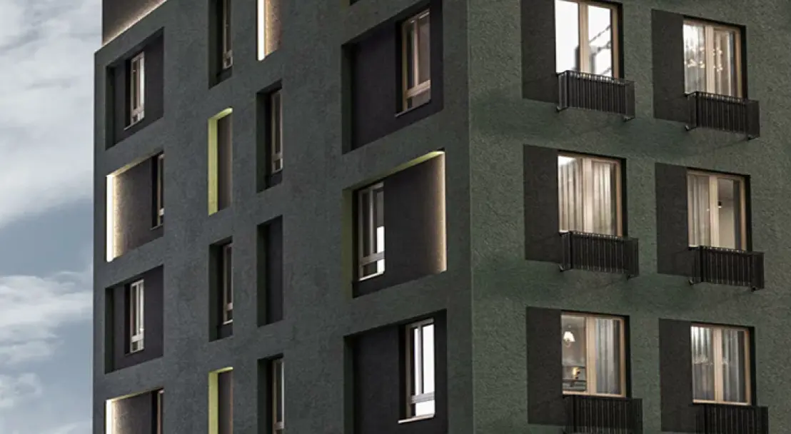 В основе фасада — цвет «виридиан». Его используют в лимитированных спорткарах Porsche, коллекциях Saint Laurent и в интерьерах замка Сетон.